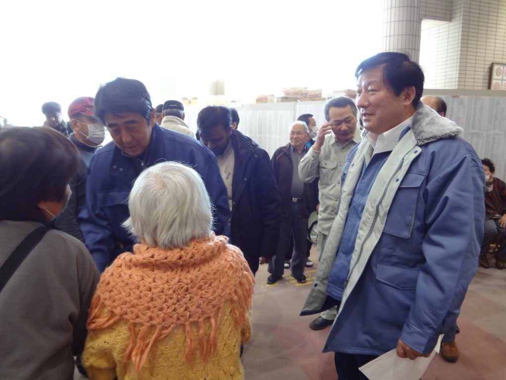 多くの避難している皆様方に安倍先生自らがしっかり激励しながら配った