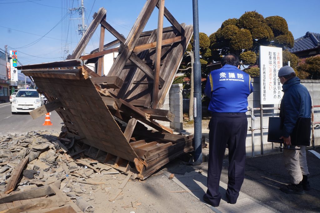 その後、新地町へ移動し大堀町長、遠藤議長よりお話を伺うと「瓦屋根の被災数が多く、応急処置用のブルーシートが足りていない」とのお話を伺ったので、すぐに手配し3時間後にお届けすることができました。