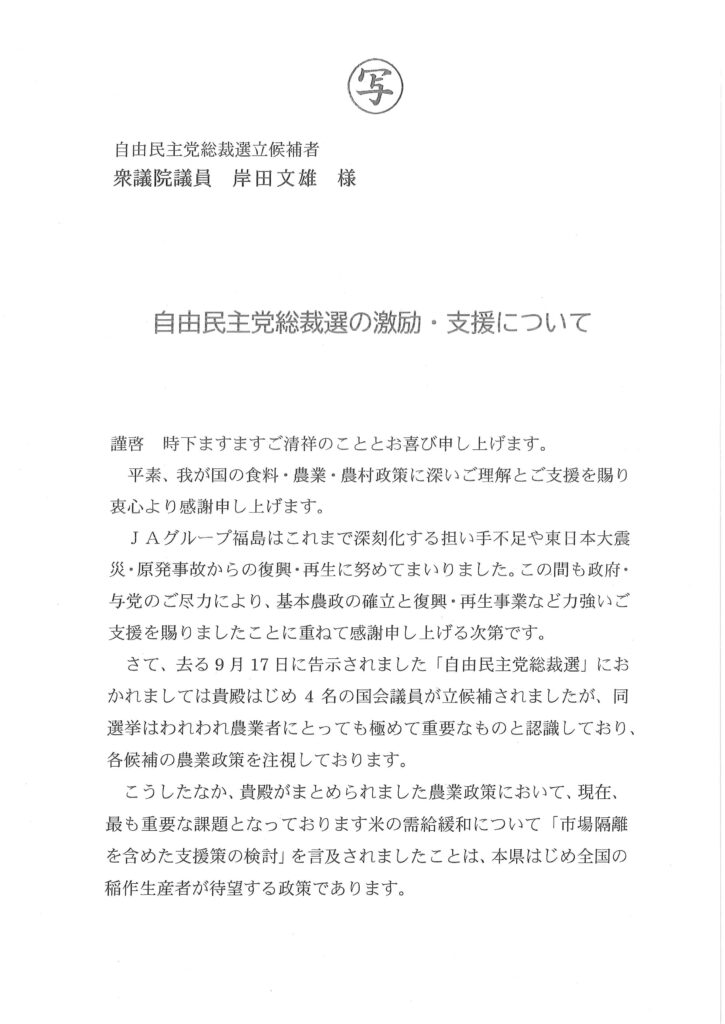9/24(金)自民党総裁選岸田候補とJA福島中央会意見交換会&激励会を開催し、JA福島五連の菅野孝志会長、JAふくしまみらい数又組合長はじめ関係者の皆様より激励・支援を表明し、「岸田ビジョン」へ福島の農業の再興を盛り込んでいただきました。