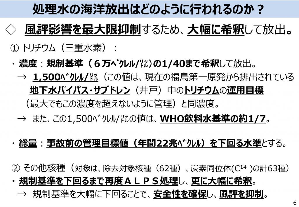 ◇基本方針に沿って、処理水を十分に希釈して海洋放出した場合、近隣への追加的な放射線影響は、トリチウム以外の核種を含めて、日本で生活する人が1年間に自然界から受ける放射線(自然放射線)影響の1/100,000未満。