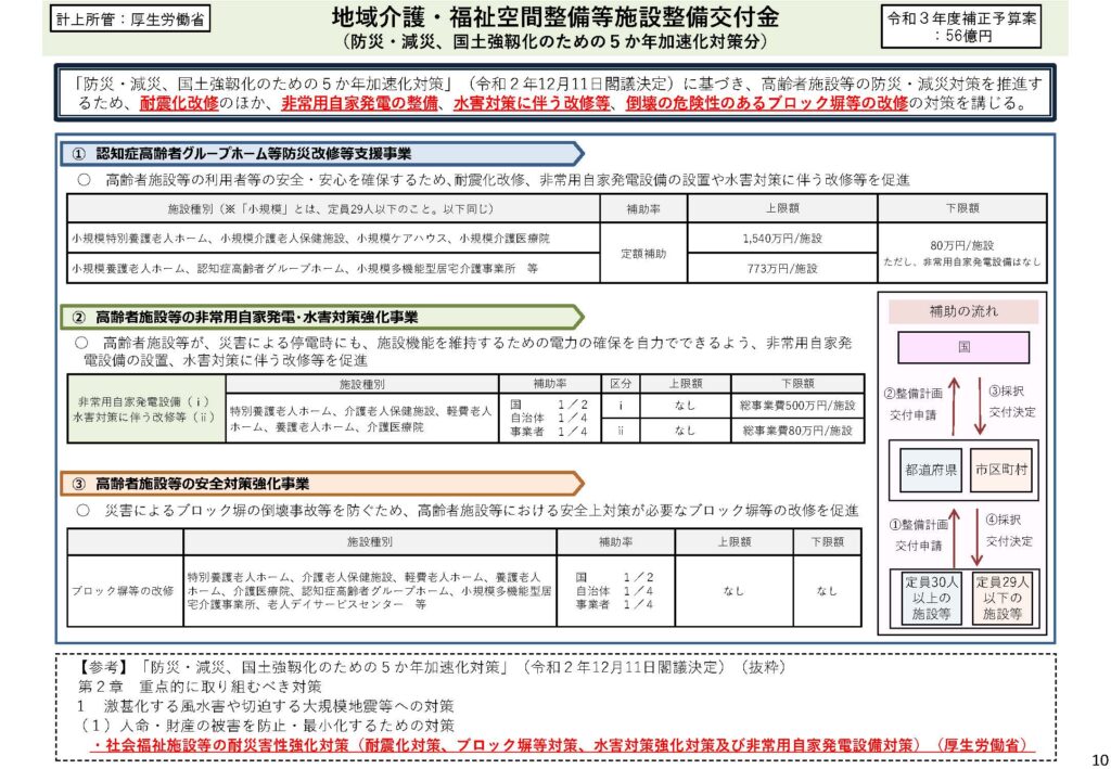 「防災・減災、国土強靱化のための5か年加速化対策」(令和2年12月11日閣議決定)に基づき、高齢者施設等の防災・減災対策を推進するため、耐震化改修のほか、非常用自家発電の整備、水害対策に伴う改修等、倒壊の危険性のあるブロック塀等の改修の対策を講じる。