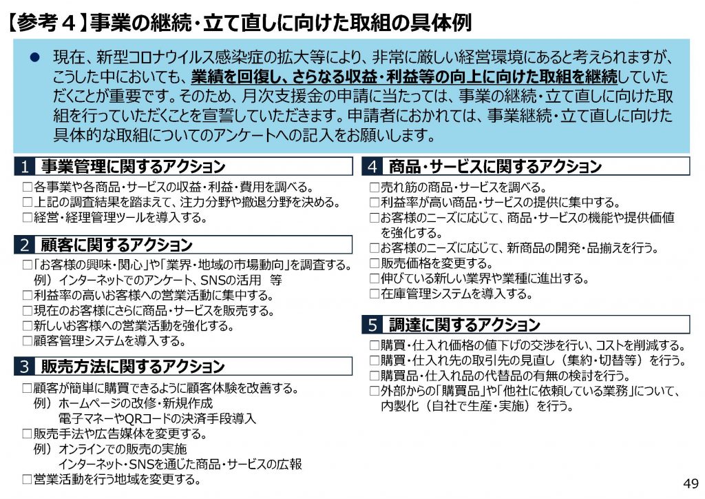 業者等の皆様に⽉次⽀援⾦を給付し、事業の継続・⽴て直しやそのための取組を⽀援します。