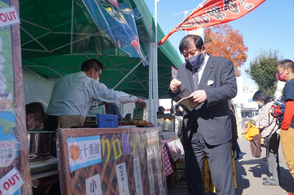 11月3日 福島うまいもの市 ~食べてエールを~(http://www.city.fukushima.fukushima.jp/toshikei-machi/machizukuri/event6.html)「商店街の日」に駅前通りの蕎麦とロックと同時開催で盛大に開催されていました。入場制限はあるものの会場には多くの人々で賑わい、福島城下うまいもの市、餃子市などグルメが並びステージイベントを楽しんでいました。会場の一角にて古関裕而メロディーバスPRのコーナーがあり福島市長と共に記念撮影を行いました。