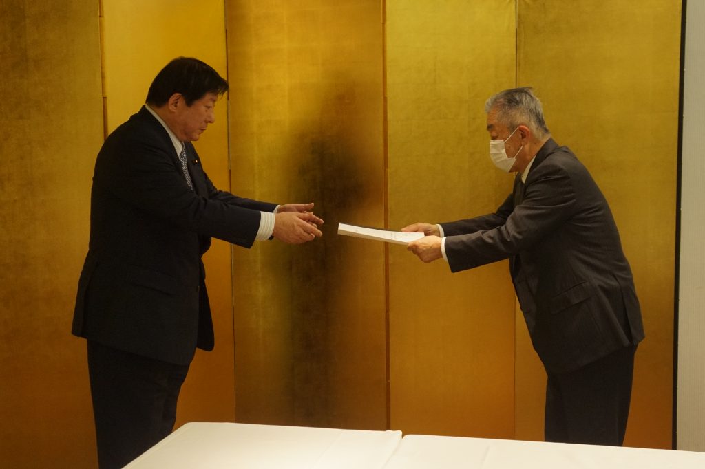 原発事故で被災してしまった地域の復興へ向け、買い物環境の整備に必要な支援策や国道6号の4車線化などの要望書を沢田一夫会長よりお受けしました。