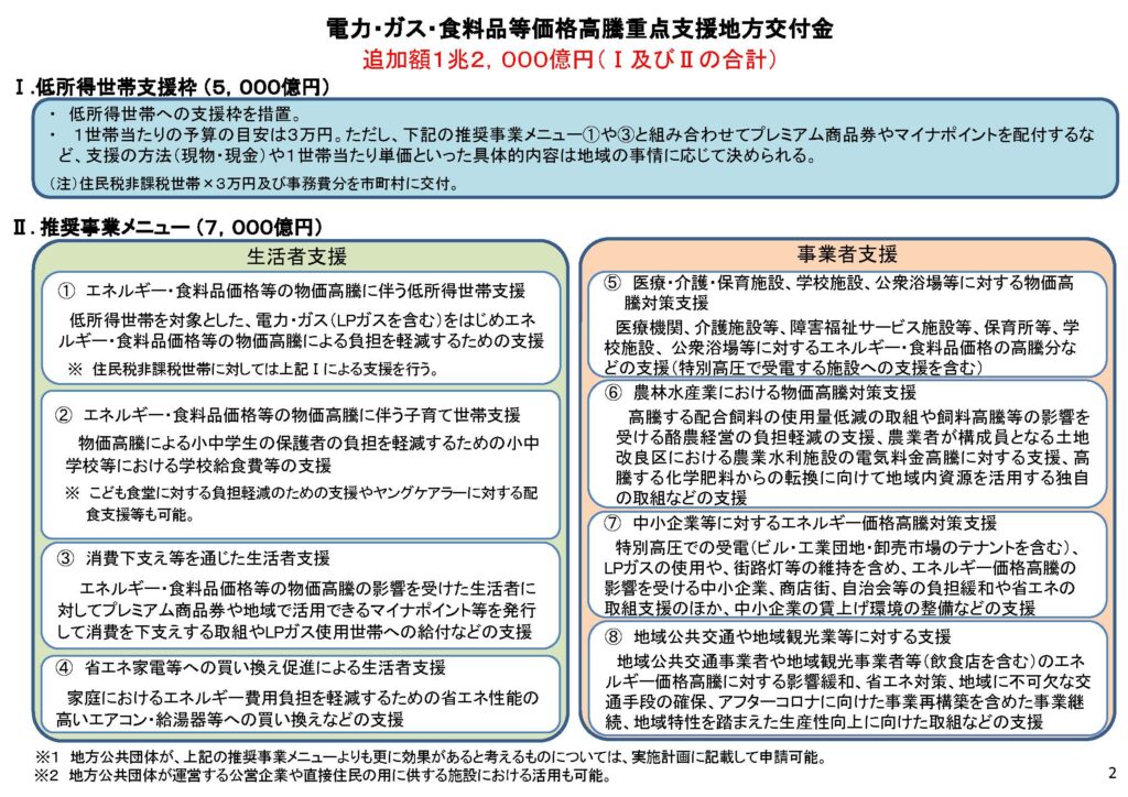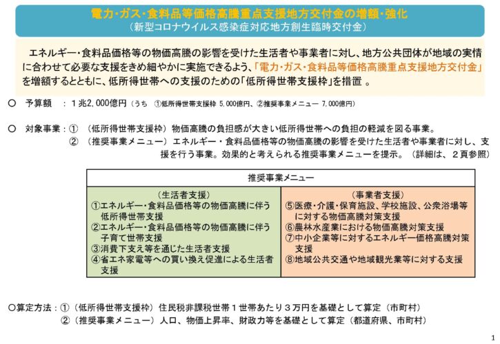 エネルギー・食料品価格等の物価高騰の影響を受けた生活者や事業者に対し、地方公共団体が地域の実情に合わせて必要な支援をきめ細やかに実施できるよう、「電力・ガス・食料品等価格高騰重点支援地方交付金」を増額するとともに、低所得世帯への支援のための「低所得世帯支援枠」を措置。